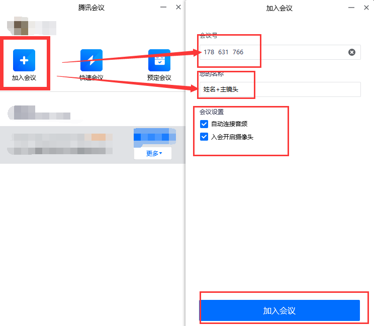 通知启用后,打开腾讯会议客户端点击加入会议,输入复试秘书提前告知的会议号,按照要求在两台设备上备注姓名+主/辅镜头,进入会议室后,选择“使用电脑音频加入”,进行身份查验,开展面试。