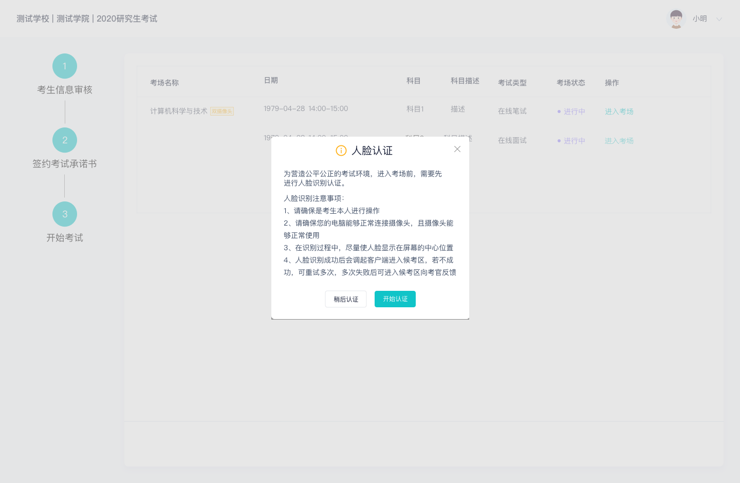 系统对接公安部数据,若认证成功可进入候考区,若认证失败可点击“重试”。若一直认证失败也可进入候考区,但在考官界面会提示“人脸识别认证未通过”,考生须将身份证原件在面试中展示给考官,进行“人证对比”。